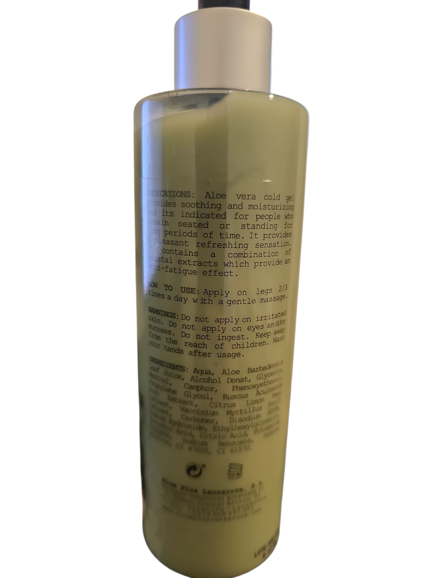 Aqua, Aloe barbadensis Leaf Juice, Alcohol Denat, Glycerin, Menthol, Camphor, Phenoxyethanol, Propylene Glycol, Ruscus Aculeatus Root Extract, Citrus Limon Peel Extract, Vaccinium Myrtillus Fruit Extract, Carbomer, Disodium EDTA, Sodium Hydroxide, Ethylhexylglycerin, Ascorbic Acid, Citric Acid, Potassium Sorbate, Sodium Benzoate, Sodium Sulfite, CI 47005, CI 61570.